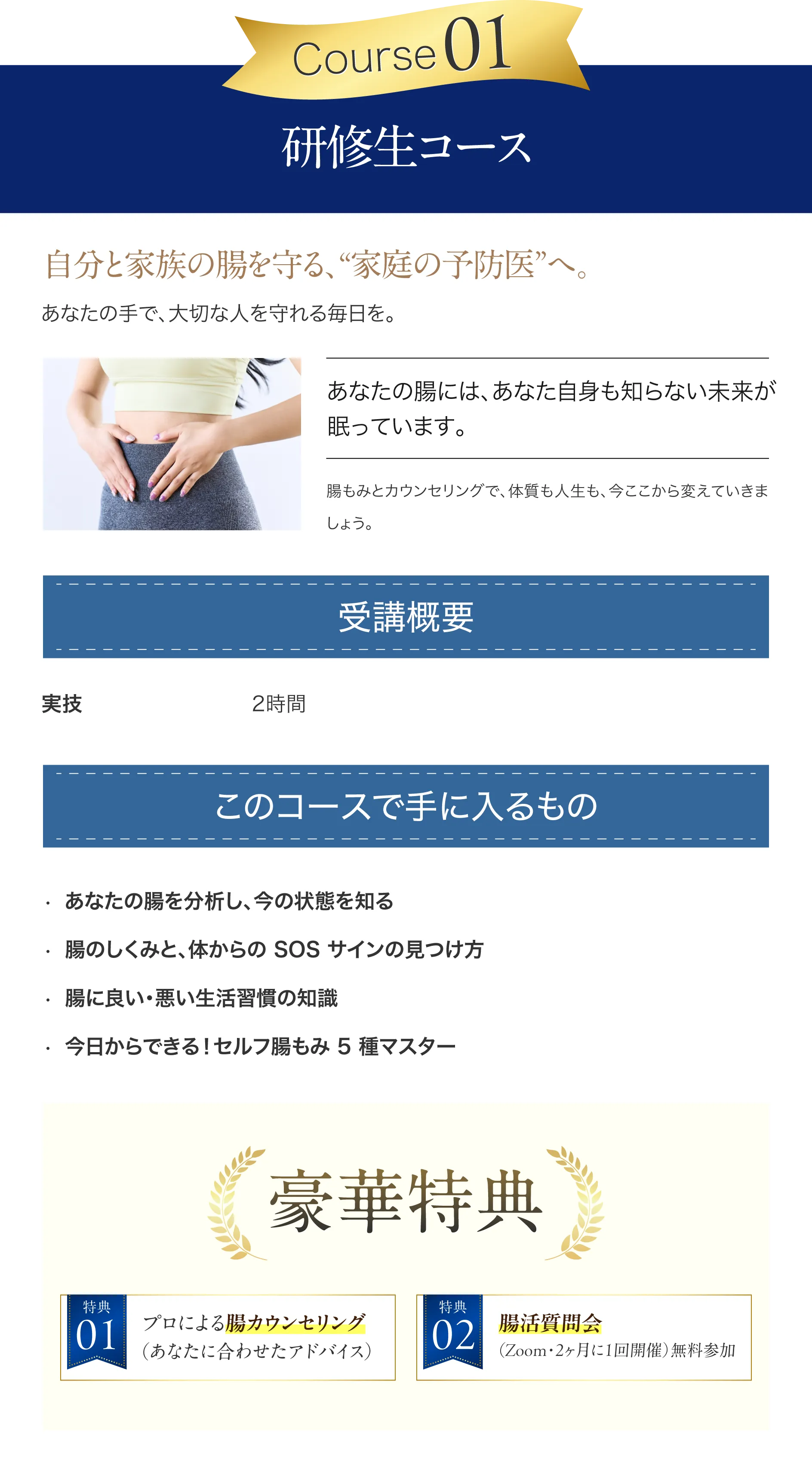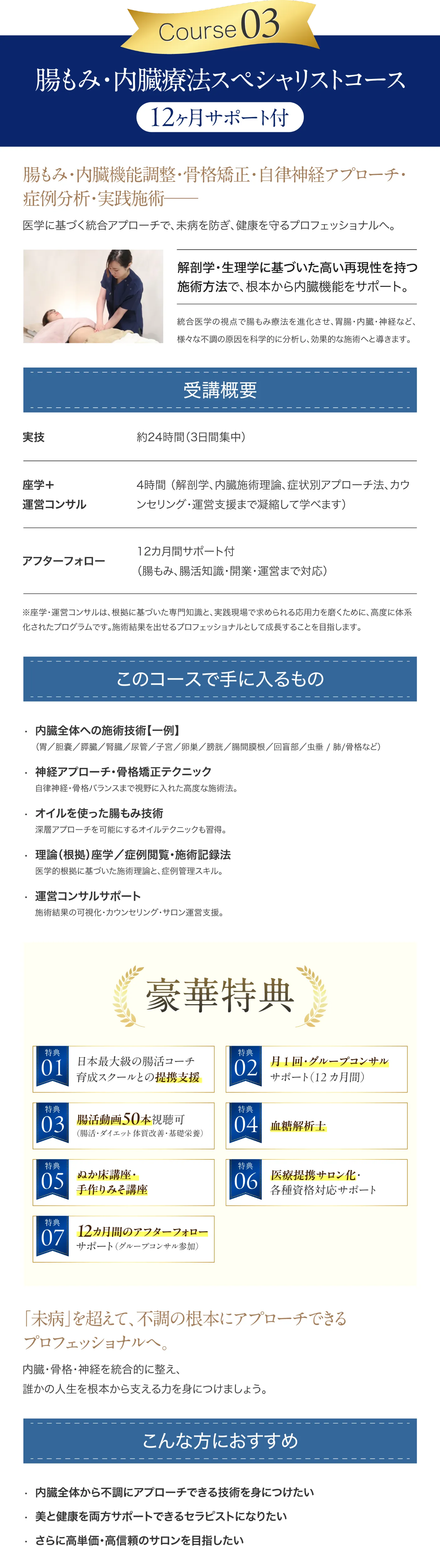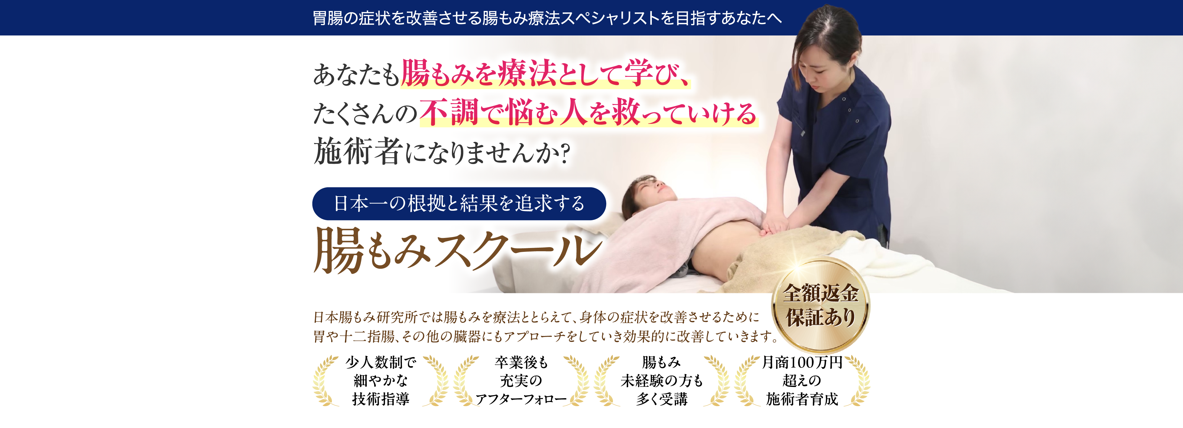 腸もみサロンの新規開業者や、既存サロンのメニュー拡充に最適な内容。