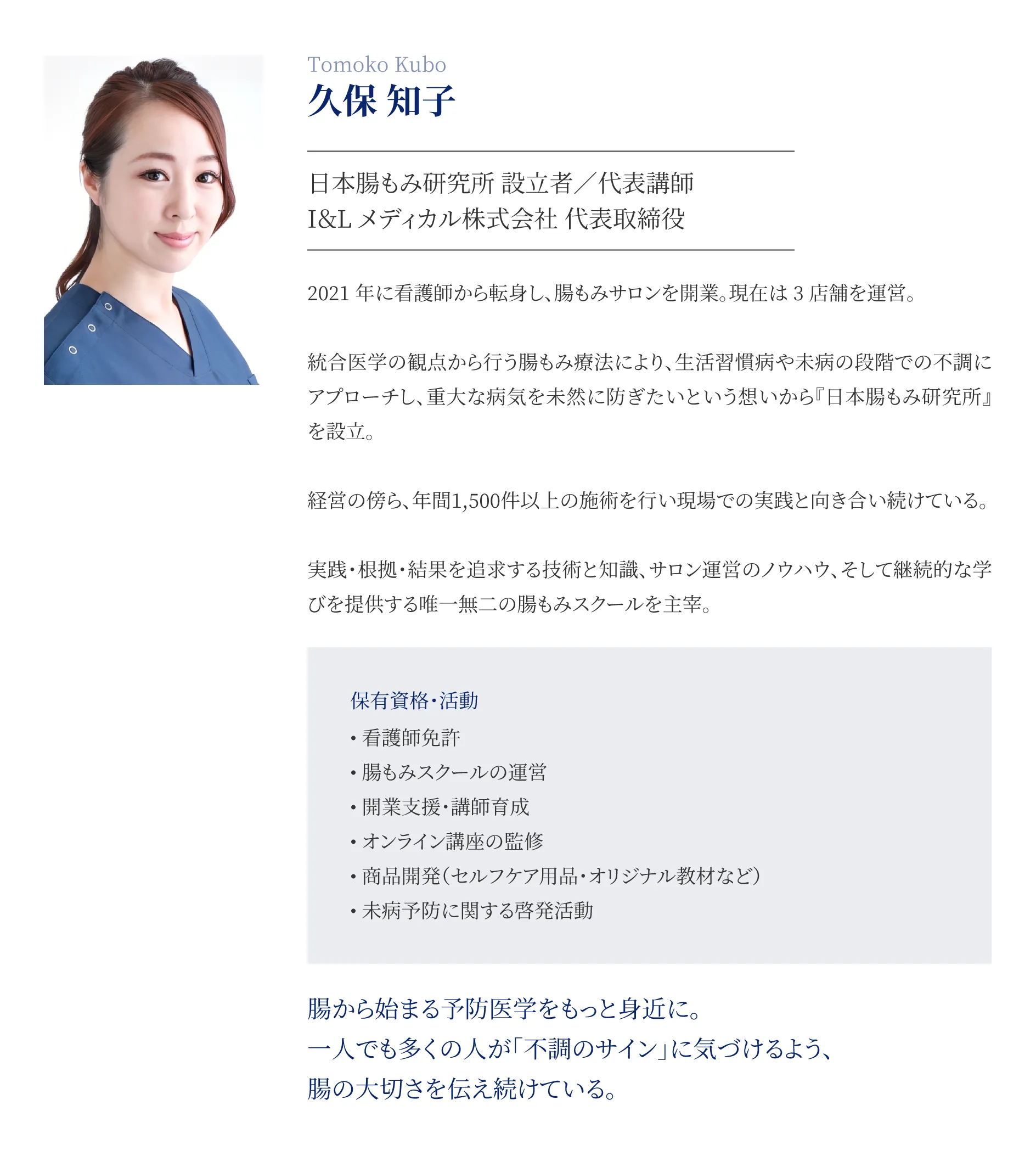 これからも管理栄養士の資格と腸もみの技術を組み合わせ、内臓からの不調を改善し、腸のケアが健康に直結していることを広めていきます。