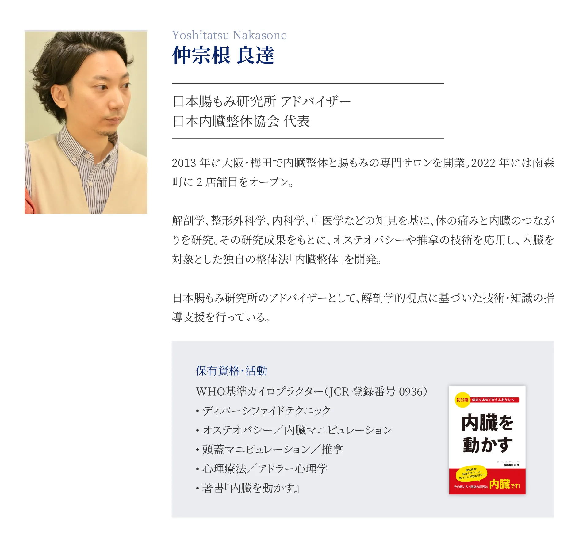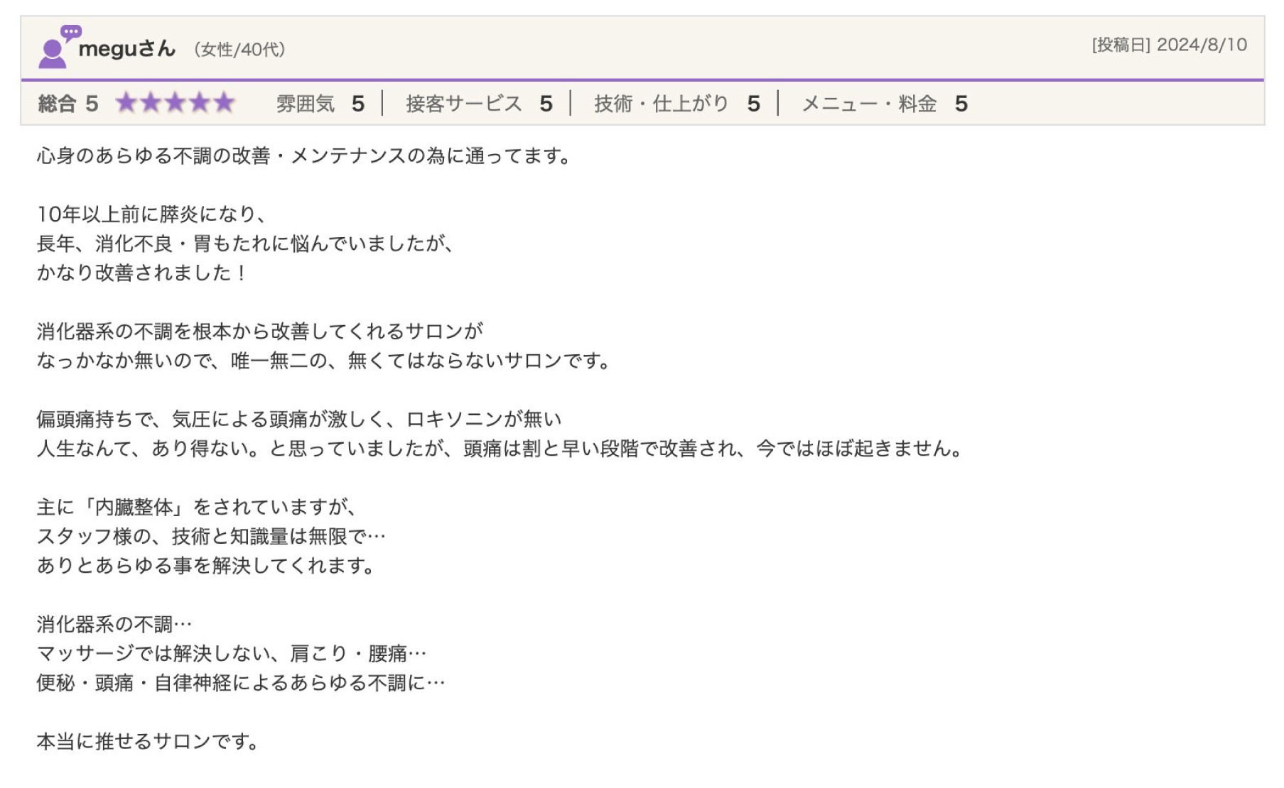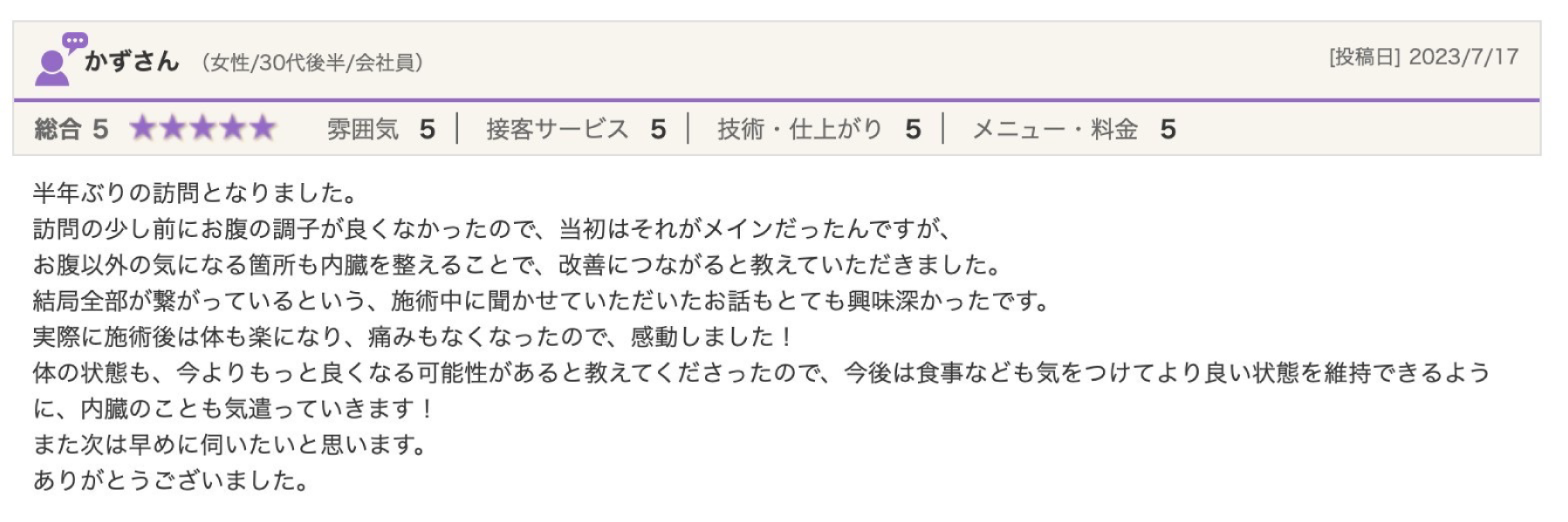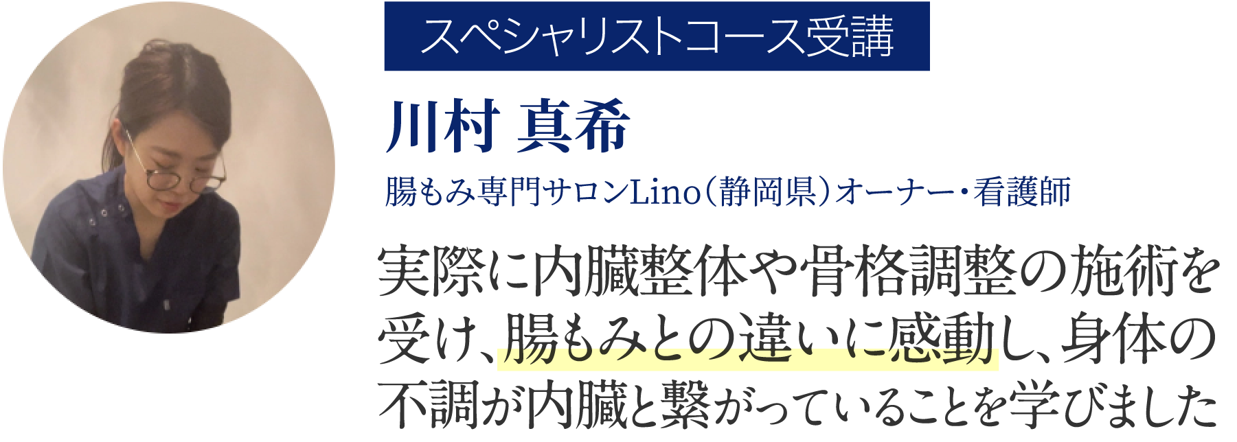 実際に内臓整体や骨格調整の施術を受け、腸もみとの違いに感動し、身体の不調が内臓と繋がっていることを学びました。これにより、お客様の身体を深く分析し、個別に対応できるようになりました。