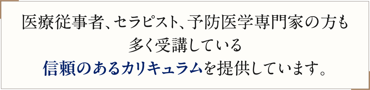 医療従事者、セラピスト、予防医学専門家の方も多く受講しており、