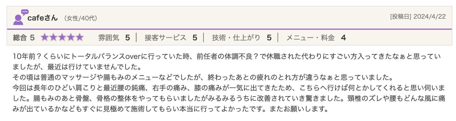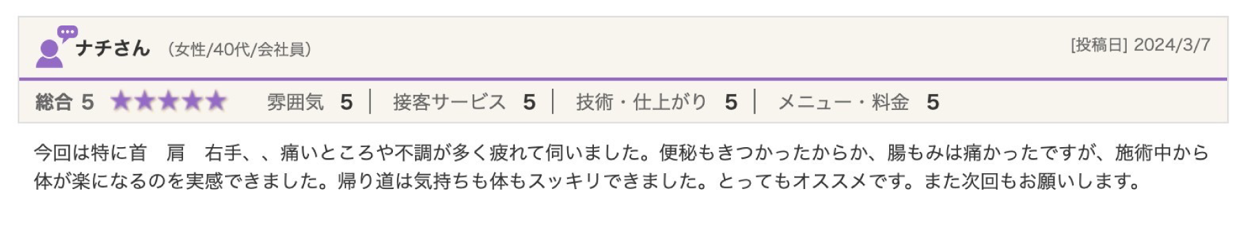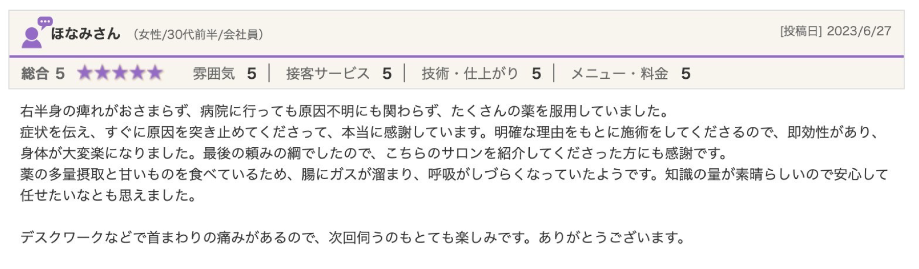 手技ひとつひとつに意味があり症状によりアプローチの仕方が異なり、解剖学・生理学を学んだ上で行う根拠のある施術だから対処療法にとどまらず解消に導けると感じました。