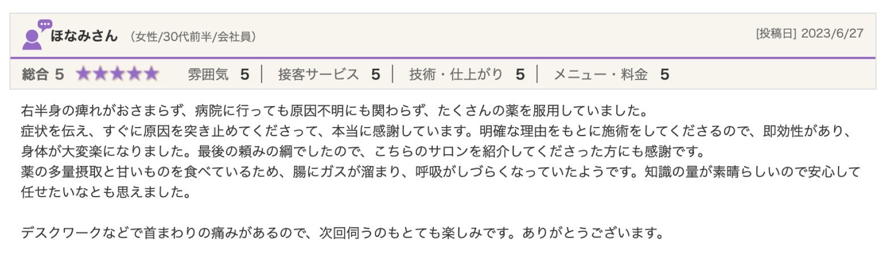病院には行くほどでないけど、悩んでいる方や未病でも何かしら不調を抱えているそんな方々の悩みを解消へと導き寄り添えるサロンとなれるようこれからも学び続けていきたいと思います。