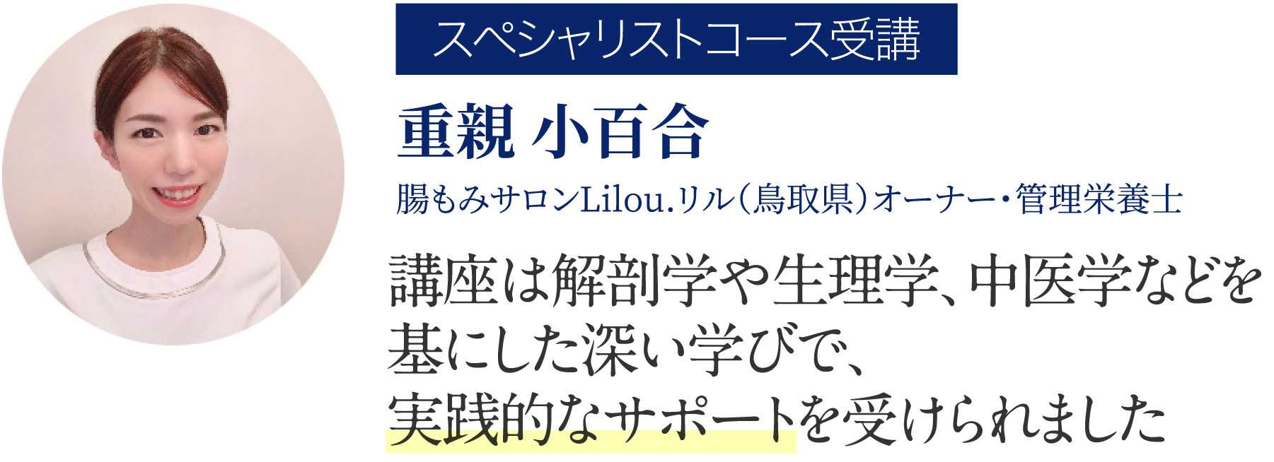 腸もみサロンを経営しており、多くのお客様のお腹に触れながら、腸もみの効果を実感していました。しかし、「なぜそうなるのか?」という疑問が湧き、Instagramで知った知子さんの腸もみ研究所の新しい講座に興味を持ち、説明会に参加しました。内容が私の疑問に一致し、受講後のサポートも充実していたため受講を決めました。