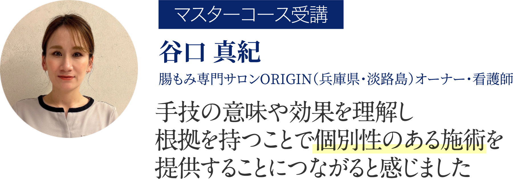 腸もみサロン開業に向け、解剖生理学を理解し自信を持って施術するためにスペシャリストコースを受講しました。看護師として多くの患者と向き合った経験から、健康な日常を楽しむ人を増やしたいと思い、予防医学を学ぶために知子さんのもとで学ぶことにしました。